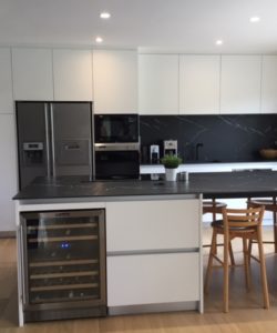 • Cuisine sur mesure, mobilier blanc, noir et rose, Marrec à Pont Aven